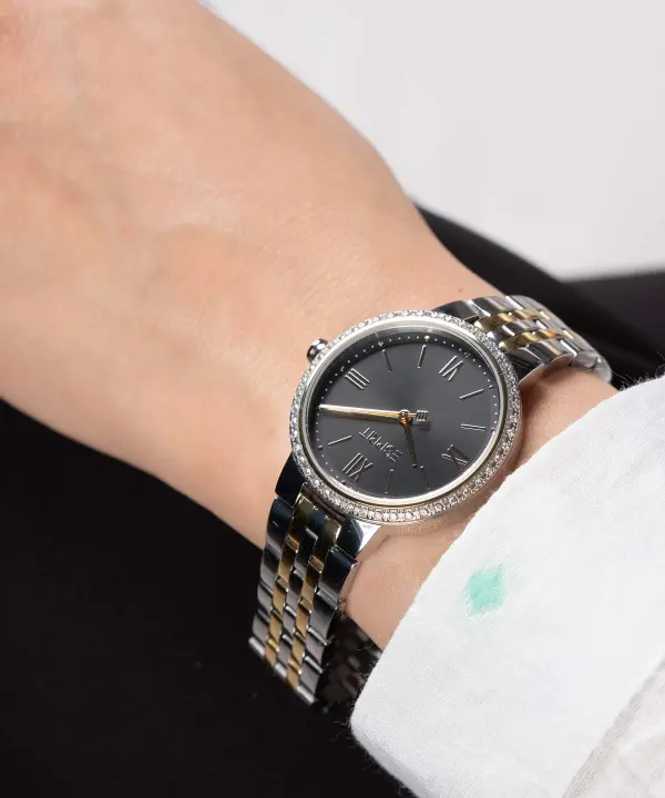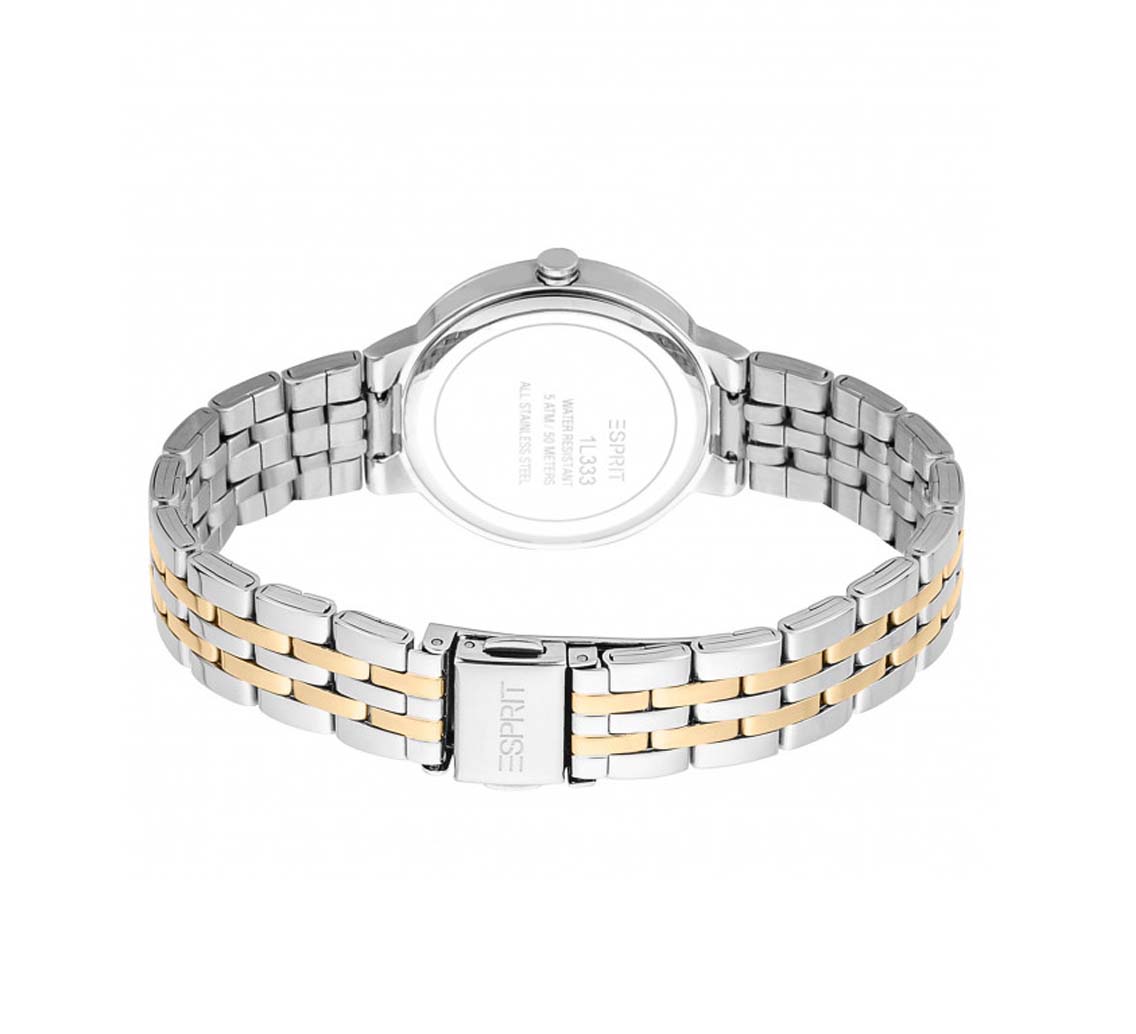 منبع انرژی: باتری جنس شیشه: کریستال معدنی جنس قاب: استیل ضدزنگ رنگ قاب: نقره ای رنگ صفحه: مشکی نوع قفل: کلیپسی ضامن دار جنس بند: استیل ضدزنگ رنگ بند: نقره ای طلایی طرح بند: پین بند نحوه بسته شدن درب پشت: فشاری میزان مقاومت در برابر فشار آب: 5ATM یا معادل فشار آب تا عمق 50 متر (در برابر مرطوب شدن و همچنین شنا کردن در آب های کم عمق مناسب است.) جزئیات مدل: قاب و بند از جنس استیل ضد زنگ و ضد حساسیت، دارای نگین های تزئینی درخشان